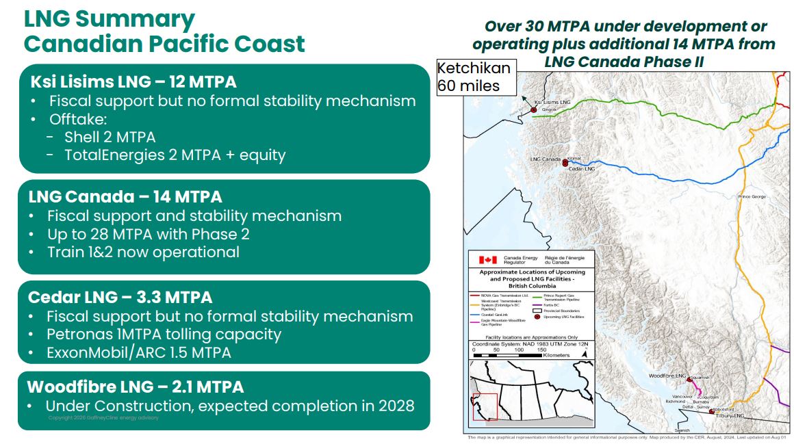 The global LNG market provides context for Alaska’s renewed interest. Current capacity stands at approximately 400 million tonnes per annum (MTPA), with projections targeting 700–800 MTPA by the early 2030s, driven largely by Asian demand. Pacific Coast projects benefit from low-cost feed gas and shorter shipping routes to premium markets. Fulford cited Petronas’s sale of a 5% stake in LNG Canada as an example of how equity can be monetized without perpetual state ownership.