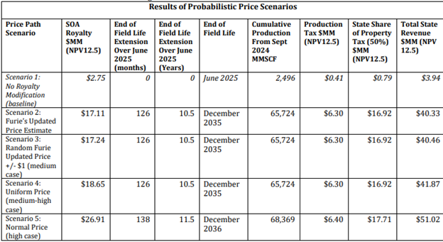Projections show a 10.5-year average field-life extension to approximately December 2035. Additional production reaches 63.2 Bcf in likely scenarios. State revenues increase substantially: in the base case, net present value (NPV at 12.5 percent discount) rises from $3.94 million without relief to $40.33 million with modification—an incremental gain of $36.38 million from higher royalties ($14.36–$15.90 million), production taxes ($5.89–$6.30 million), and the state’s 50% share of property taxes ($16.13–$16.92 million). Even conservative models confirm net gains. DNR concluded with clear and convincing evidence that continued production would otherwise become uneconomic and that the modification serves the public interest by extending local supply, preserving jobs, and maximizing economic benefits compared with early shutdown.