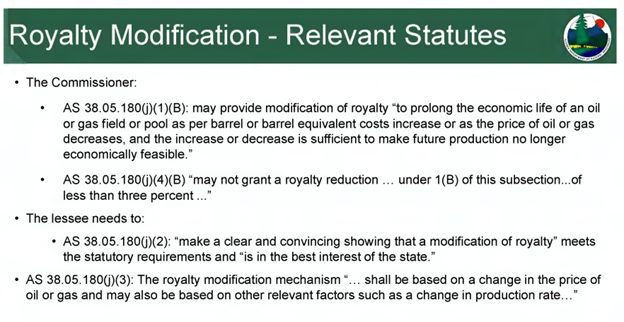 DNR conducted independent stochastic analysis across multiple price and production scenarios. The modification sets the state royalty at 3% monthly until cumulative gross revenue from September 1, 2024, reaches a DNR-adjusted $712 million target (based on full platform redevelopment costs for up to 12 new sidetracks/re-drills by 2028), after which it reverts to 12.5 percent. The change is retroactive to September 1, 2024, and non-assignable without approval, with six-month audits and termination rights if conditions change.