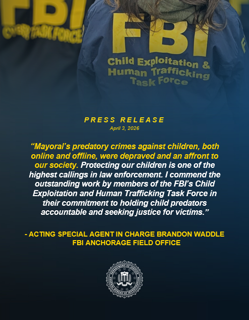 Acting Special Agent in Charge Brandon Waddle of the FBI Anchorage Field Office stated, “Mayoral’s predatory crimes against children, both online and offline, were depraved and an affront to our society. Protecting our children is one of the highest callings in law enforcement. I commend the outstanding work by members of the FBI’s Child Exploitation and Human Trafficking Task Force in their commitment to holding child predators accountable and seeking justice for victims.”