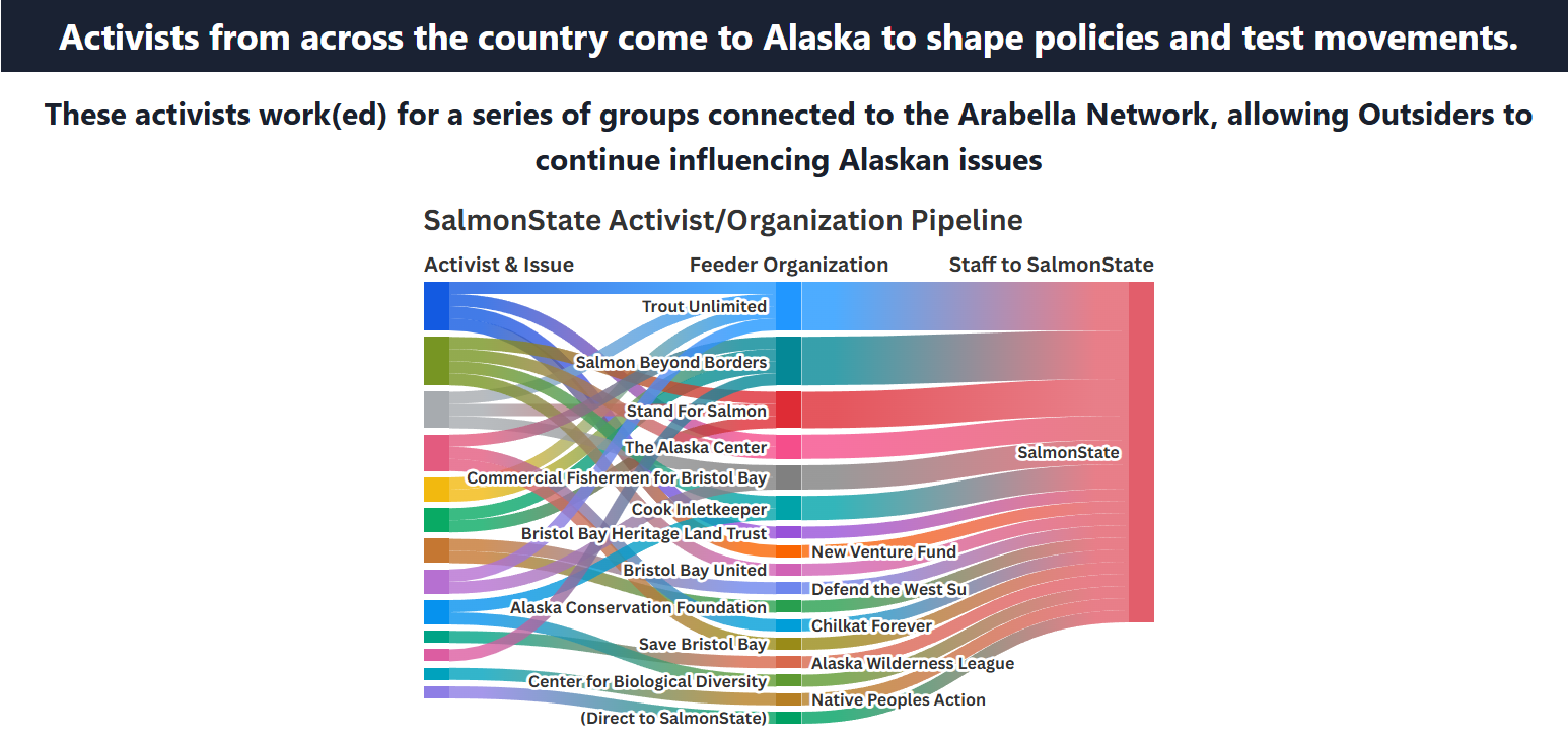 The Alaska Influence Pipeline flags several entities that brand themselves as Alaskan organizations but rely heavily on out-of-state funding.