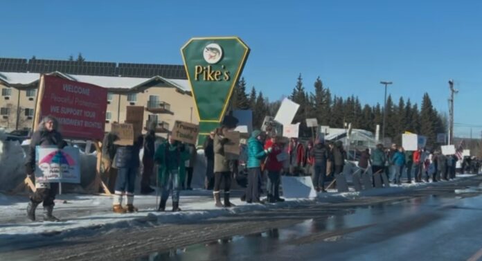 But the Republicans in Fairbanks were ready for them: They posted a 4×8 sign in front of the venue that said, “Welcome Peaceful Protesters We Respect Your First Amendment Rights.”