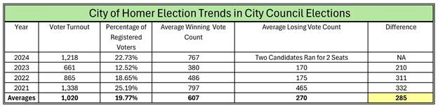 You can see Homer’s participation in presidential elections illustrated in Table 1. The city voter turnout is typically in the high 60% range, and often exceeds the national average. In the last three elections, the Republican candidate won by large majorities of 15-20%. We often hear that Homer is a liberal town, but not when it counts in presidential elections.