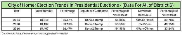 You can see Homer’s participation in presidential elections illustrated in Table 1. The city voter turnout is typically in the high 60% range, and often exceeds the national average. In the last three elections, the Republican candidate won by large majorities of 15-20%. We often hear that Homer is a liberal town, but not when it counts in presidential elections.