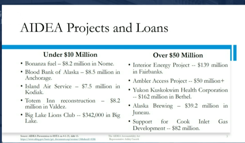 Today, Jan 22, Representative Ashley Carrick (D-Fairbanks) introduced HB 124, the AIDEA Accountability Act, to the House State Affairs Committee. HB 124 seeks to enhance “legislative and public oversight of AIDEA as a state corporation.”