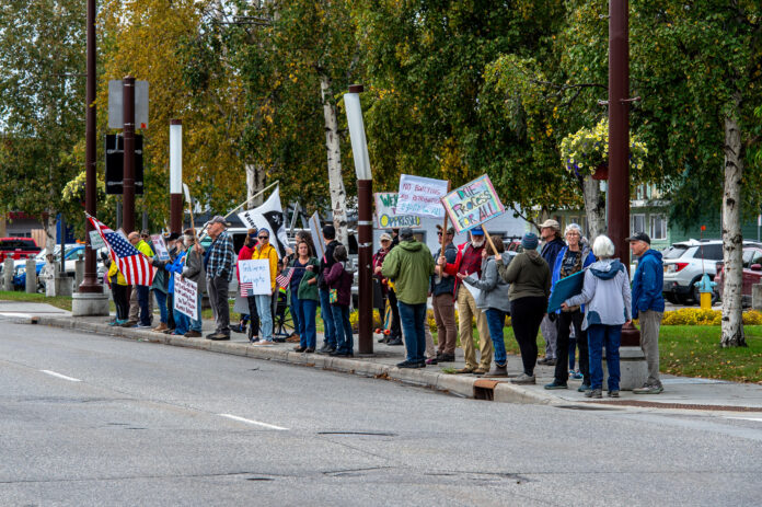 A small group of demonstrators gathered outside Fairbanks City Hall on Cushman Street for a Labor Day protest, carrying signs and flags in support of various causes.
