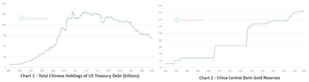 It shouldn’t be this way. For the last 40 years, as trade between the United States and China has increased, the trade imbalance between the two countries has forced China to purchase US Treasury debt with its excess dollars. There are valid financial reasons for China to hold treasuries. They receive interest payments, and these holdings stabilize their currency against the US dollar. However, in 2012, something happened, and China began selling its US debt holdings to purchase gold. They have continued this practice every year for the past 13 years, and even as gold has tripled in price, they continue to buy it. Since 2012, China has cut its holdings of US debt in half and doubled its gold reserves. (See Charts 1 and 2).