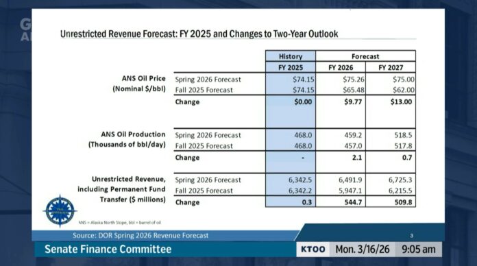 The Alaska Senate Finance Committee convened Monday for a high-stakes session centered on the Department of Revenue’s long-awaited spring revenue forecast and detailed life-cycle modeling of a hypothetical new oil field. The committee received updated projections showing meaningful revenue gains driven by higher Alaska North Slope oil prices. Yet presenters repeatedly stressed unprecedented market uncertainty, with volatility indices at near-record levels and wide probability bands that could swing unrestricted general fund revenue by billions.