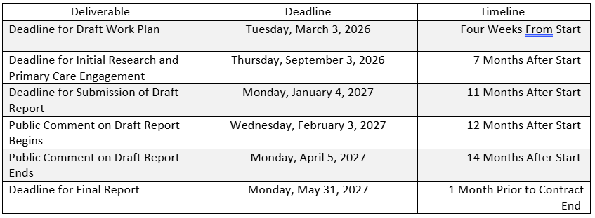 The report is expected to take approximately a year and a half to complete. The project’s provided deliverables timeline determines the final report will be completed May 31, 2027.