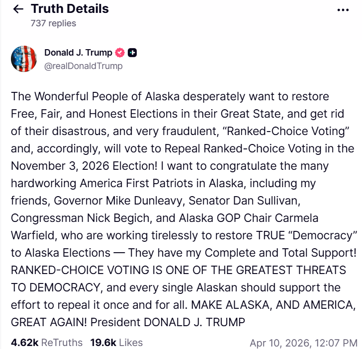 Last Friday, April 10, President Trump posted on Truth Social about the “disastrous, and very fraudulent” ranked-choice voting (RCV) system. He thanked Governor Mike Dunleavy, Senator Dan Sullivan, Congressman Nick Begich, and Alaska GOP Chair Carmela Warfield for working hard to repeal RCV. “They have my Complete and Total Support,” he stated.