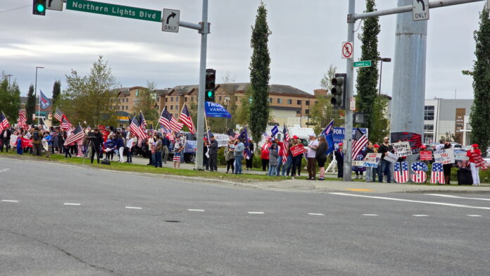 Supporters of President Donald Trump and those hoping Ukraine-Russia peace will be negotiated between the president and President Vladimir Putin showed up at 11 am at the corner of Seward Highway and Northern Lights Blvd. in Anchorage, at the same time that the peace talks were set to begin on Joint Base Elmendorf-Richardson.
