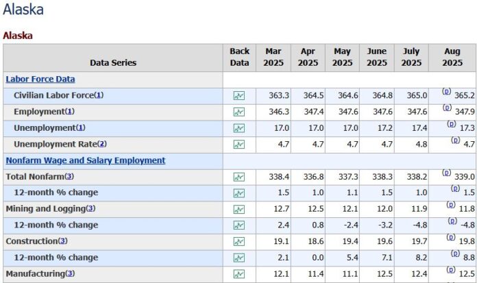 Regionally, Alaska saw 800 jobs added in August 2025 (according to the latest available state data), bringing total nonfarm employment to 339,000. Construction and manufacturing saw the highest 12-month gains in August.