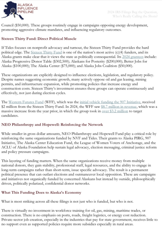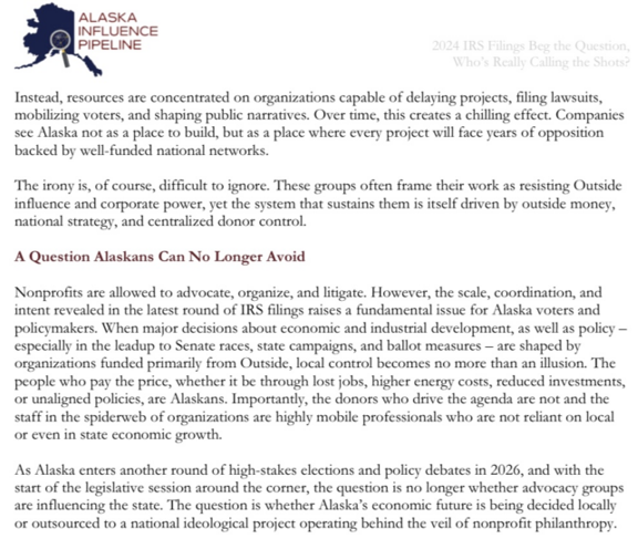 - Economy: Funding is carefully structured to prioritize litigation, delays, and narrative shaping over job creation or infrastructure development. The “chilling effect” is real: permitting challenges, populist pressure, and lawsuits deter companies, shift economic priorities away from local industries, and leave Alaska increasingly reliant on grant money instead of investment.
