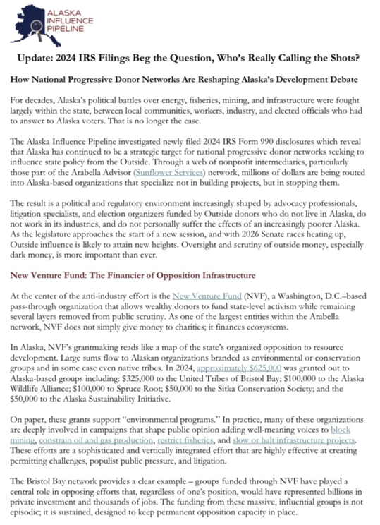 - Media Outlets: The Alaska Current ($100,000 from NVF) amplifies anti-development narratives.